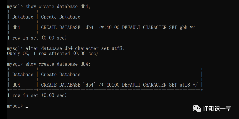 修改数据库的字符集:Alter database 数据库名称 character set 字符集名称;