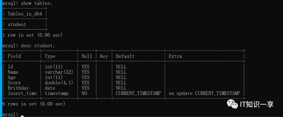 创建表Create table student(Id int,Name varchar(32),Age int,Score double(4,1),Brithday Date,Insert_time timestamp);复制表:Create table 表明 like 被复制的表名
