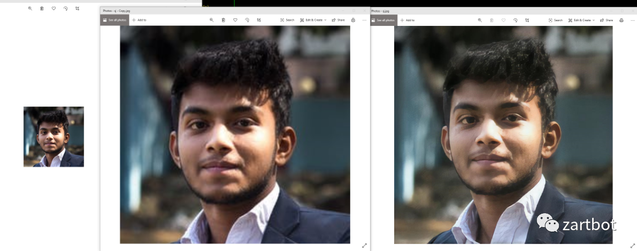 但是大量的场景是客户通常觉得有趣的图经过多次传播分辨率都变得很低,常见的计算数学学到的插值方法都效果不好,那么为什么不探索一下AI呢?随手搜了一些模型,找几个现成的调一下参,搞定~左边是原图,中间是原图放大,右边是AI处理的。