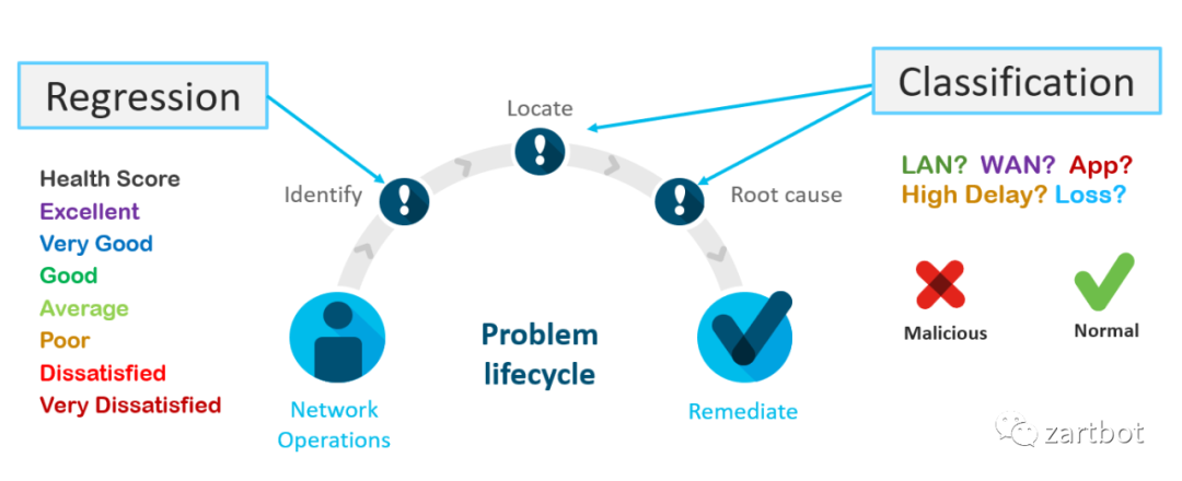 本质上机器学习的主要就是解决两类问题:分类(Classification)和回归(Regression),对于网络管理员而言,通过回归分析可以对网络状态进行一个分数度量,而分类则是通过决策树等一系列算法自动推理出故障源并分析出故障原因,只贴个图。
