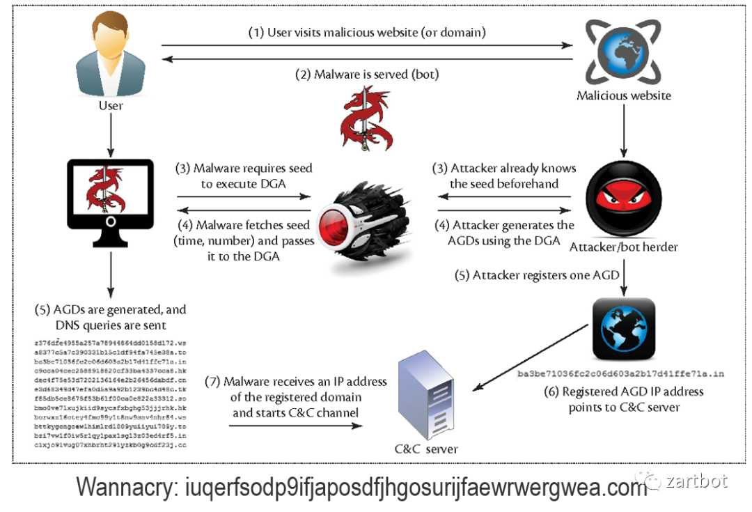 与以往的破坏行为不同,现在网络安全的最大威胁来自于勒索,常见的做法是让受控主机和C&C(Command and Control,简称C2)主机进行通信并接受控制,勒索的触发都需要涉及如何和C2通信。C2自然会是那种过街老鼠,东躲西藏,通常的做法是按照某种特定的算法生成一个DNS域名,通过查询获得地址,例如wannacry所采用的域名。