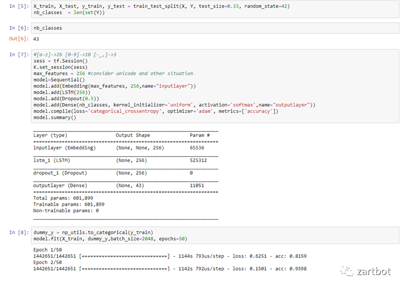 如上图所示,白名单在左,黑名单在右,完全转换成一串数字了吧。训练很简单LSTM炼丹就好了。参数都不用多调整。