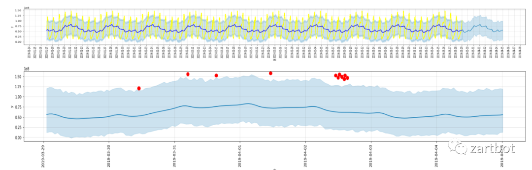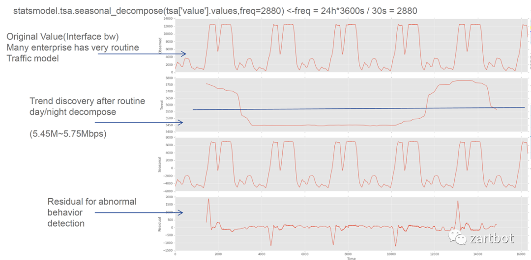 一些较为简单的场景,特别是很多运维数据具有季节性周期时,还可以Seasonal Decompose一类的算法,分离趋势和周期性波动,对于系统容量预测和运维异常(观测残差)等非常有用,下图大概是我8年前做的一个实验