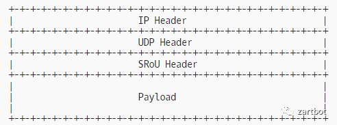 SRoU本质上就是把SRH放入UDP Payload中,同时针对IPv4网络中NAT的问题,实现了NAT穿越和中继节点无状态转发等功能。报文封装格式如下: