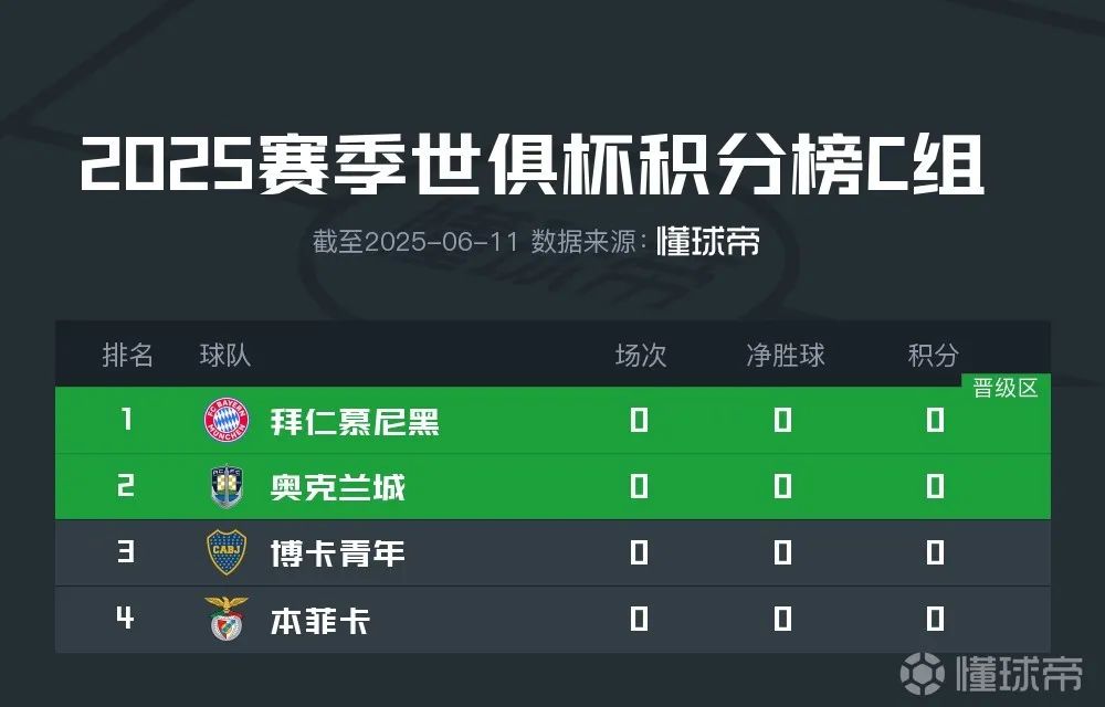 拜仁慕尼黑作为欧洲顶级豪门,拥有凯恩、穆夏拉等核心球员,是本组第一的头号热门。葡超劲旅本菲卡虽然历史上曾两夺欧冠,但近年更多以培养年轻球员见长,阵容深度不及拜仁,将与博卡青年争夺第二名。奥克兰城作为大洋洲唯一代表,是本届赛事的最大黑马,国内联赛统治力显著,且有中国球员周通坐镇,团队配合默契,可能成为本组搅局者。