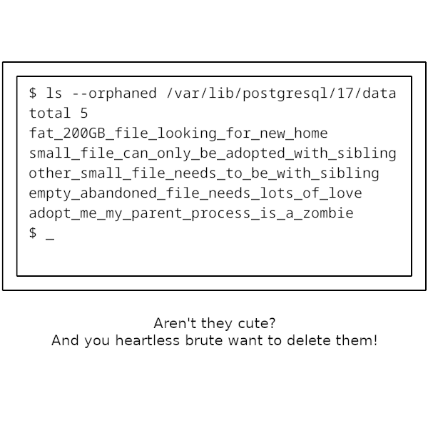 PostgreSQL 以其稳定性而闻名,这毋庸置疑。但这并不意味着它永远不会崩溃。虽然 PostgreSQL 通常会自行清理,但在崩溃后它并没有很好的清理方法(毕竟它丢失了内存)。因此,你的数据目录中可能会出现一些孤立的文件。如果这些文件很小,你可能不会担心。但有时你的数据目录中可能会出现很多垃圾文件。众所周知,解决这个问题非常困难,所以我决定写一篇文章来解决这个问题。