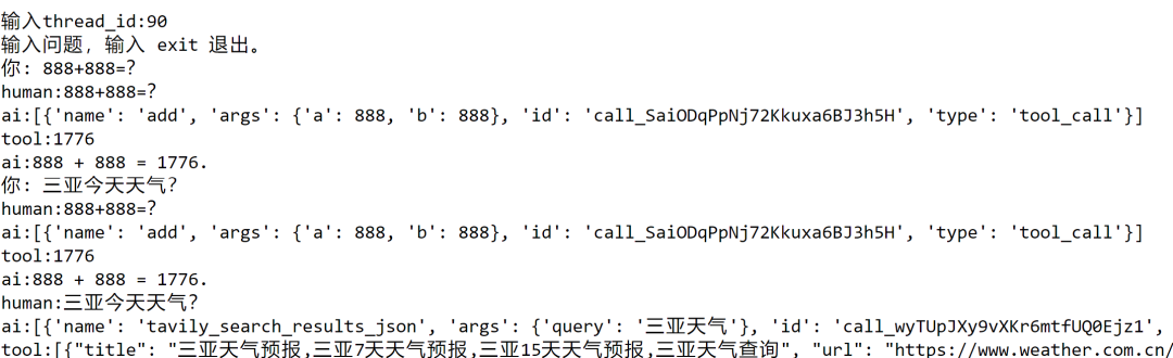 while True:query = input("你: ")if query.strip().lower() == "exit":breakinput_messages = [HumanMessage(query)]response = agent_excuter.invoke({"messages": input_messages}, config=config)for message in response["messages"]:if hasattr(message, "content") and message.content:print(f"{message.type}:{message.content}")if hasattr(message, "tool_calls") and message.tool_calls:print(f"{message.type}:{message.tool_calls}")