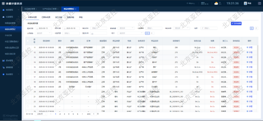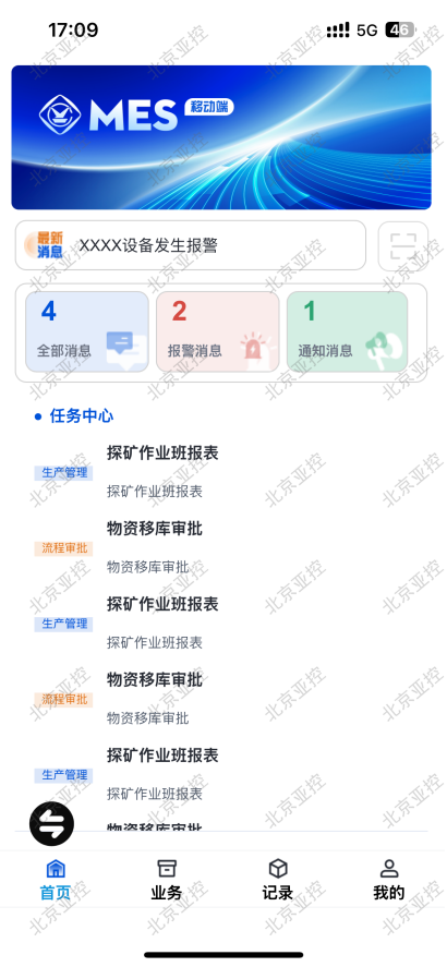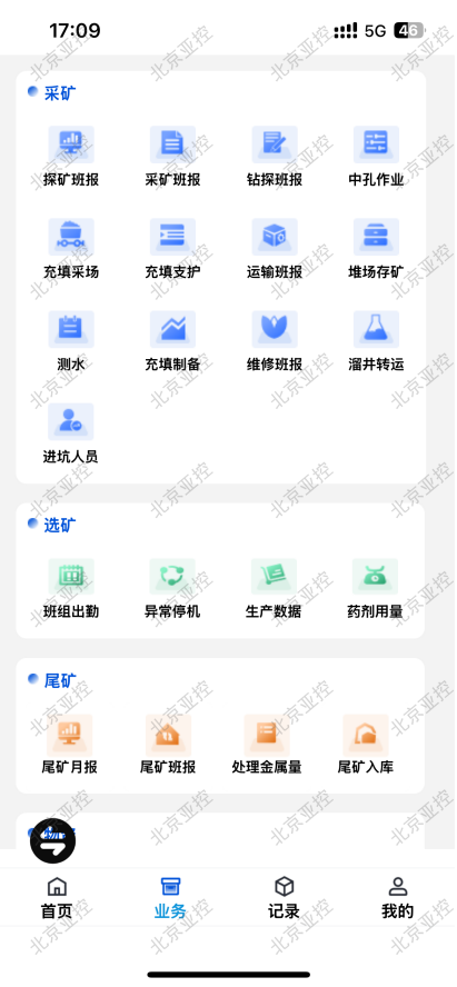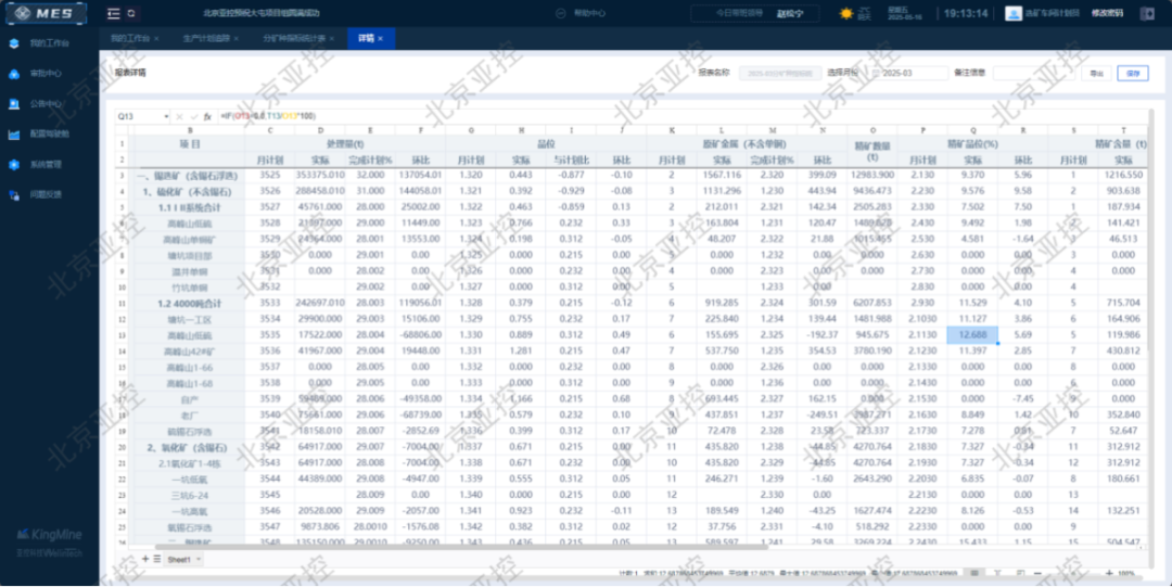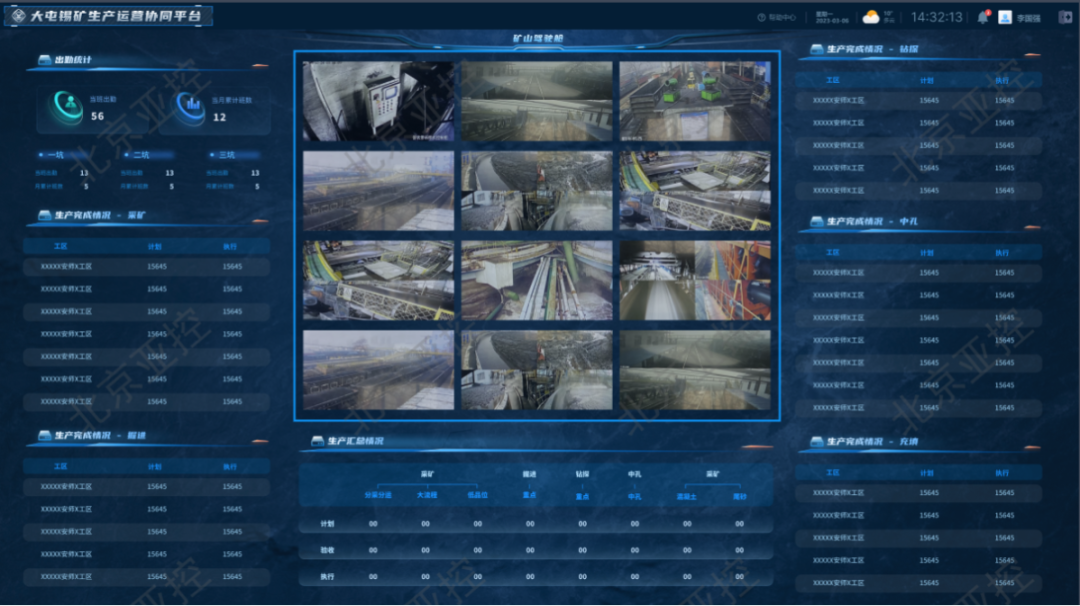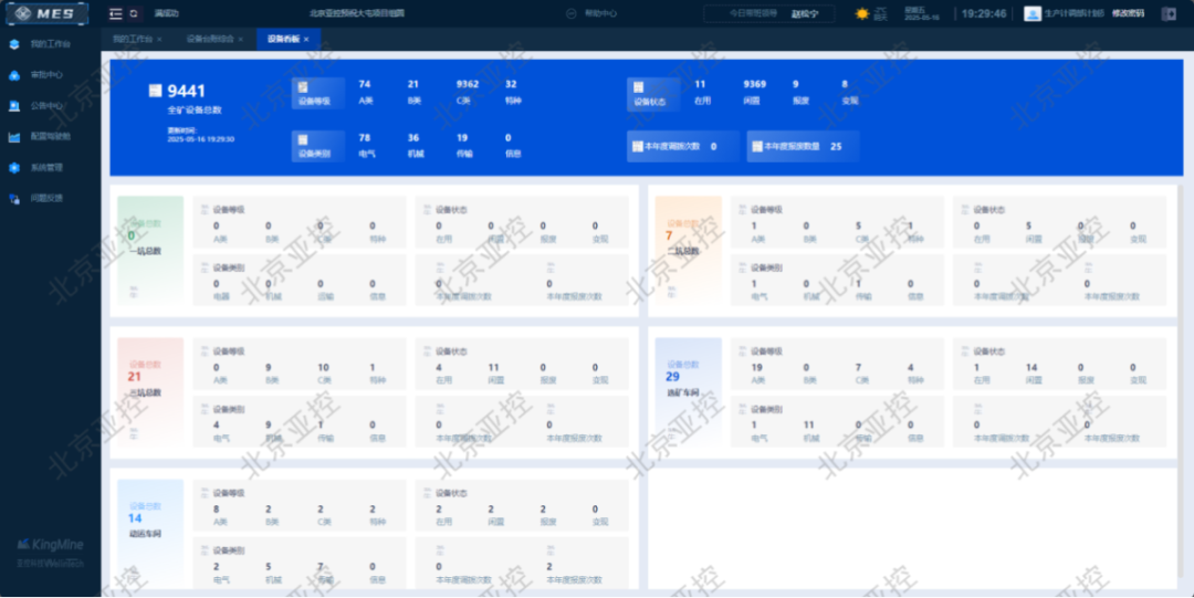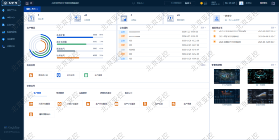 在KingMine平台主界面中涵盖了生产管理、调度监控、物资管理、设备管理、计质计量管理、可视化驾驶舱等功能,其中侧栏菜单中,用户可以按业务需求自行定制。以下为各系统界面展示: