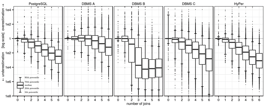 查询优化是数据库系统中的核心问题。给定一个SQL查询,传统的基于代价的优化器(Cost-Based Optimizer, CBO)枚举所有可能的执行计划,并利用代价估计模型估计不同执行计划的代价,从中选出代价最小的计划,交给执行器执行。然而,在庞杂的计划空间中估计每个执行计划的代价绝非易事,传统方法往往产生巨大的误差,进而导致次优甚至灾难的计划被执行。Viktor Leis 等人的实验研究 [1] 表明,随着查询中连接数的增加,传统的基数估计算法的误差逐渐增大,甚至有若干数量级的误差(如下图)。在最受欢迎的开源数据库 PostgreSQL 和其他商业数据库都有类似的表现,准确估计执行代价并选出较好的执行计划对传统 CBO 是一项挑战。