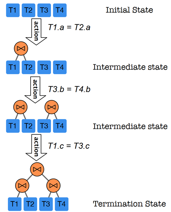 下面以端到端的学习型优化器为例,简单进行介绍。其思想是将查询优化问题建模为马尔可夫决策过程(MDP),如下图所示。