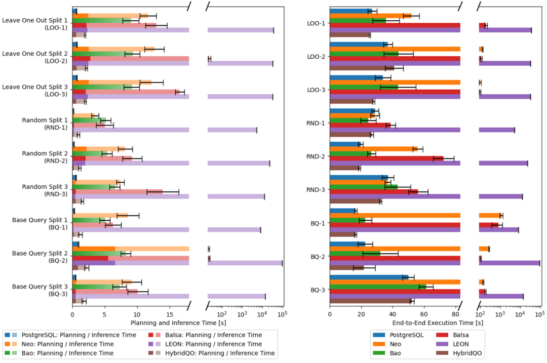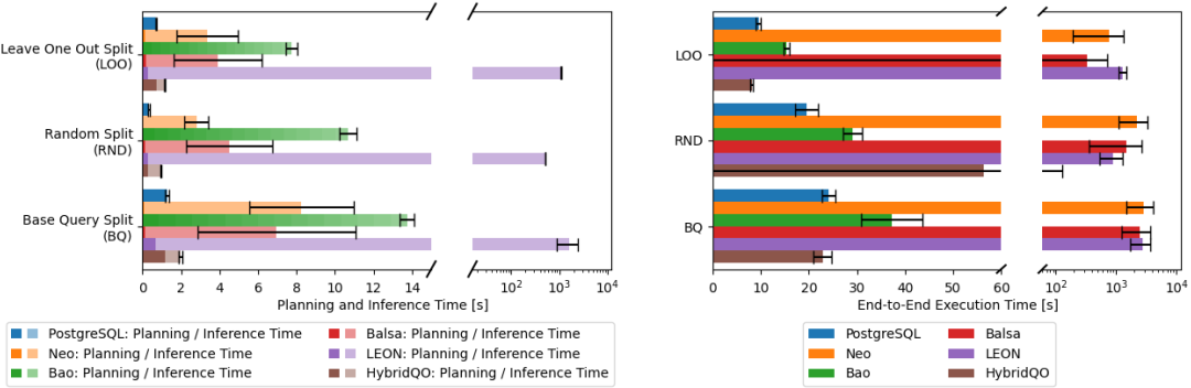 下图是 JOB 数据集上的实验结果,左图为 planning(搜索)和 inference(模型推理)时间,有图为 end-to-end(端到端)时间。从左图看到,LQO 相比于 PostgreSQL,在优化阶段花得时间要多一些。其中,LEON 的时间已经大到不可接受的程度,最坏可能 到 秒。其他方法的时间,在几秒到几十秒不等,HybridQO最短。当我们看到右图的端到端时间时,结果同样令人大跌眼镜,PostgreSQL 几乎持续胜出。基于学习的方法只有HybridQO稍好,能在若干场景下胜出。其次是Bao,能够生成和PostgreSQL质量相当的计划,只不过慢在了推理和规划的时间。