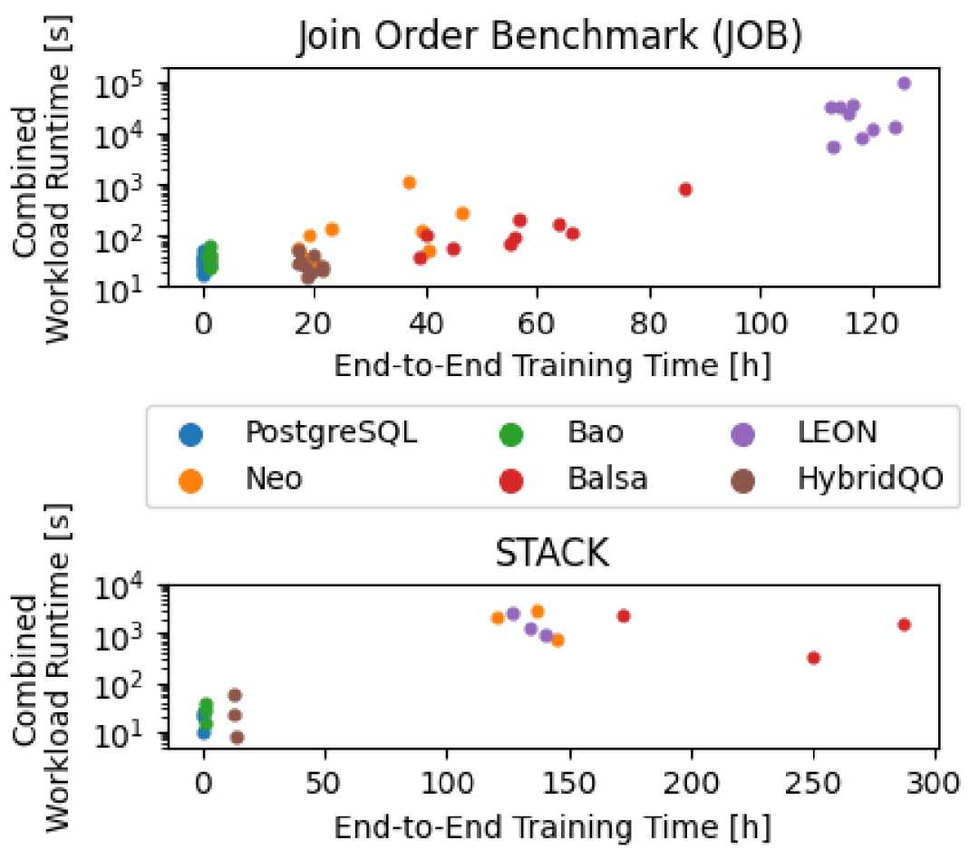 最后,作者汇总了每个实验对应的模型训练时间。我们看到,模型的训练往往需要几十个小时,其中主要的时间是要反复执行查询的各种计划。需要强调的是,两个数据集中训练查询都只有不到 100 个,但却消耗如此之长的时间,而且也没能比过 PostgreSQL。LQO 的数据效率还是太低了,花太长时间才能得到一条训练数据。