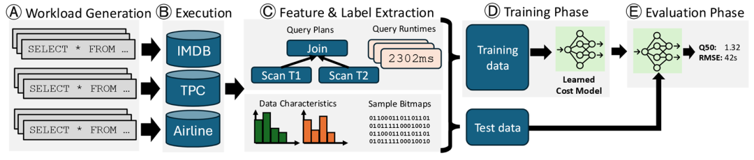 学习型优化器 LQO 并没有取得令人满意的结果,我们把目光转向学习型代价模型(LCM)。代价模型的目的是给定一个查询的执行计划,估计其执行代价。传统的方法是考虑计划的每一步的中间结果的大小,通过人工设计的计算公式,综合考虑 IO 代价、CPU 代价等因素。而基于学习的方法则是将查询计划作为输入特征,用回归模型来预测执行代价。LCM 的经典工作流如下图所示 [4]。
