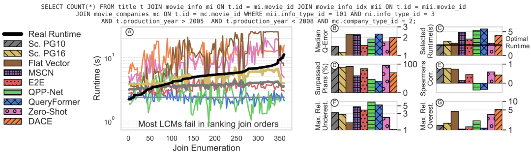 本工作注意到,现有的对 LCM 的评估只关注了估计的准确性,而没有从考虑 LCM 对查询优化任务的贡献。即,能否得到更好的计划,改善端到端时间。因此,本文从查询优化的角度,对 LCM 进行了系统的实验。面向连接顺序、访问路径选择、物理算子选择三个查询优化的子任务,展开实验,下面依次介绍。