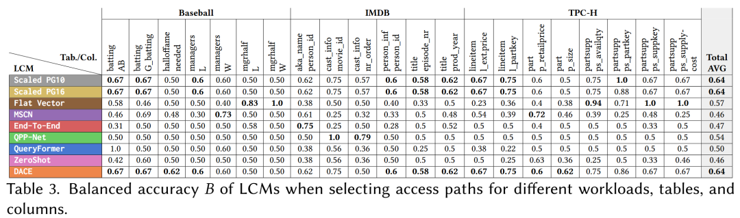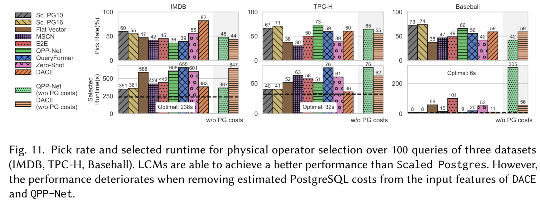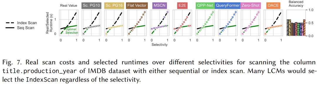 在 IMDB 数据集上的效果如下图。可以看到,几乎所有的 LCM 都是默认选择索引扫描(Index Scan)。作者分析了训练数据,发现训练数据集中只有10%的索引扫描,这些都是索引扫描真正有益的场景,因此模型盲目任务索引扫描更好,这同样是数据集有偏导致的。
