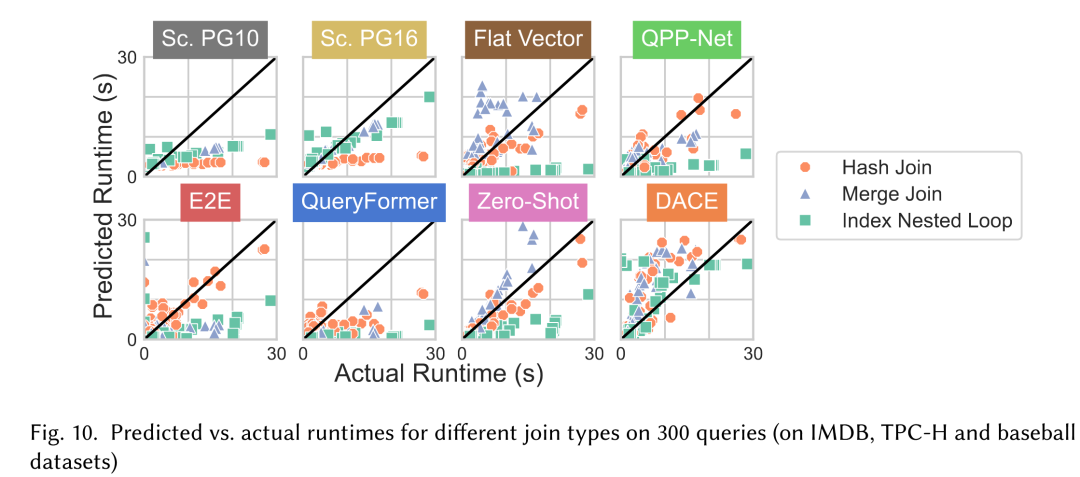 先看模型对不同算子的执行时间的估计,如下图,数据点靠近斜线意味着估计的准。从图中看出,LCM普遍估计很差,特别是很多都低估了 Index Nested Loop Join 的代价,这同样是因为训练数据集的问题。