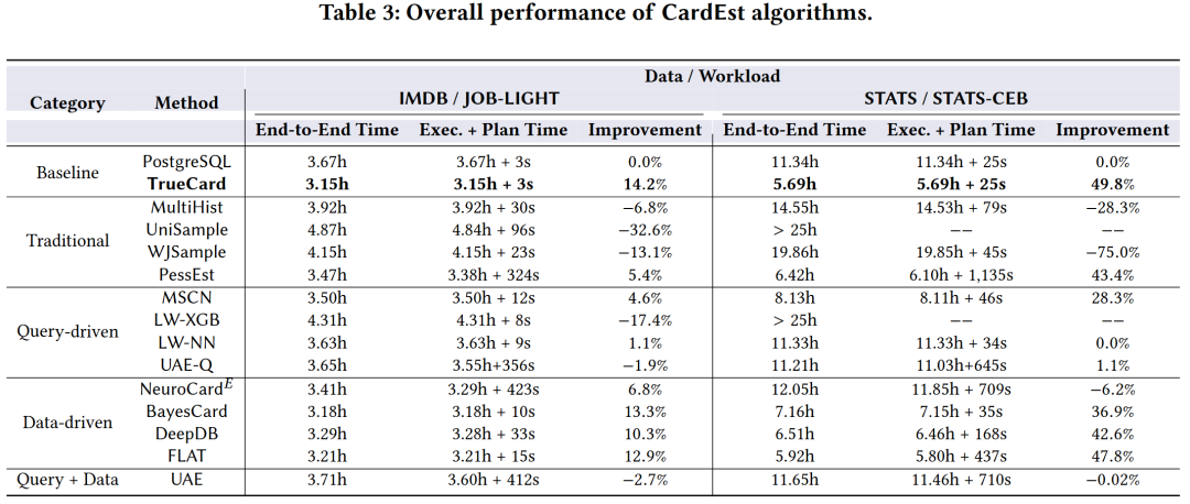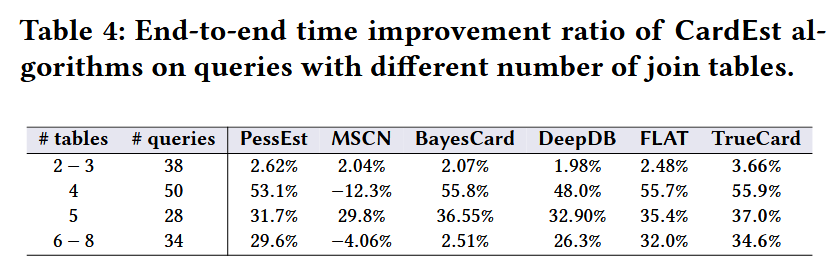 下面介绍 Yuxing Han、Ziniu Wu 等人的实验论文“Cardinality Estimation in DBMS: A Comprehensive Benchmark Evaluation”,发表在 VLDB 2022。这个工作中,对主流的学习型基数估计方法进行了端到端实验,并证明了在许多场景下,特别是复杂查询下,LCE 是有益的,能减少端到端时间。