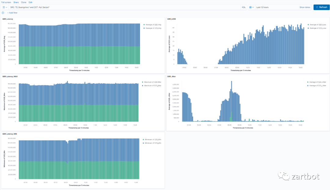 然后可以通过ElasticSearch或者任何其它的软件随便画个图,我承认我是懒,而且数据量不大直接丢elk了,例如我们可以看到腾讯广州到阿里SJC的性能: