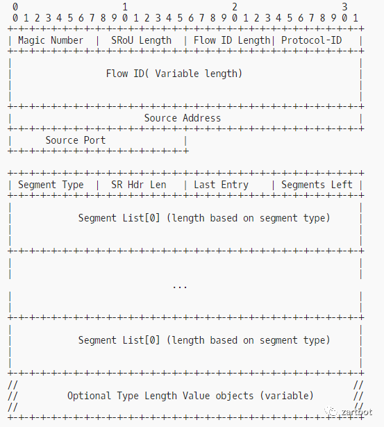 协议定义是变长的,在报头也有一个Length字段帮助ASIC定位,但工程实现上可以定义为一个64bit或者128bit flowid,它的用途一方面是用于做基于流的监控和分析,类似于Google Dapper的TraceID,而SID-List则可以作为Parent-ID使用,