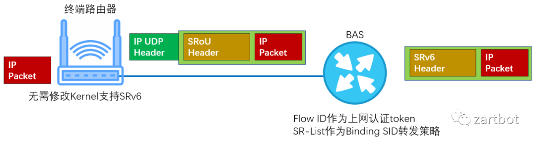 另一方面它可以用作一些智能的BRAS业务。传统的BRAS设备需要与终端建立复杂的通信机制,业务流程上来看极大的影响了BRAS的容量,而终端的光猫需要一些增值带宽业务,PPPoE协议又限制了网络可编程能力,SRv6又要Kernel升级导致很多光猫维护升级代价过大,通过SRoU flowID字段可以在接入网为IPv4网络的时候,构建灵活的Userspace支持的编程能力,通过UDP隧道实现和BRAS的互通,同时可以把SRv6的Binding SID直接放置于FlowID字段中,BRAS行为更加简洁。