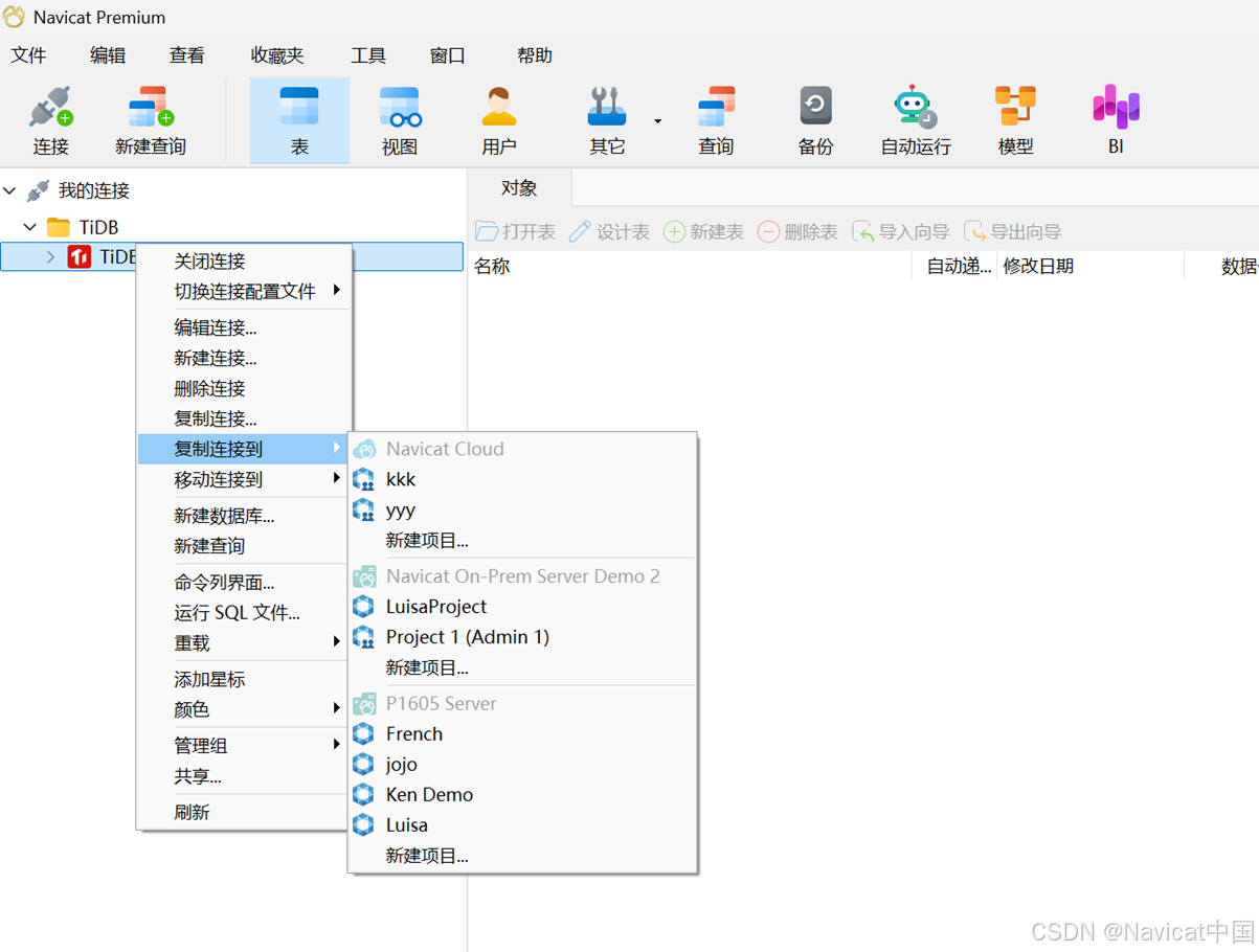 如果你已登录 Navicat Cloud 或 On-Prem Server(关于 Navicat Cloud Portal / 关于 Navicat On-Prem Server | Navicat 在线手册),你可以将“我的连接”中的连接同步到项目。右键单击“我的连接”中的任一个 TiDB 连接,然后选择“复制连接到”或“移动连接到”,选择移动/复制到的项目或移动/复制到新建项目中。