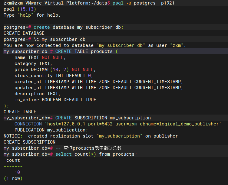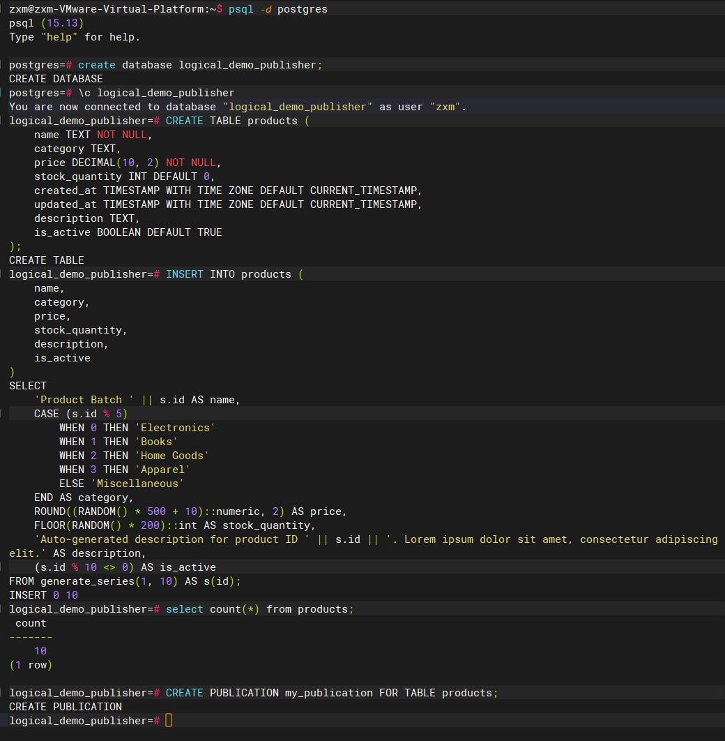 CREATE PUBLICATION my_publication FOR TABLE products;运行如下图所示: