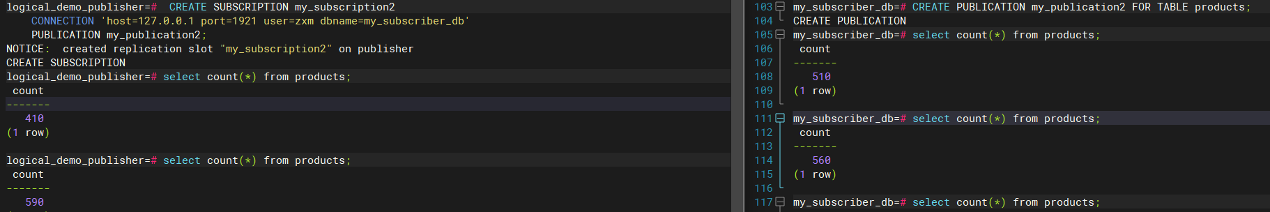 可以看到的是数据条数是一致的。实际的逻辑就是logical_demo_publisher --> my_subscriber_db