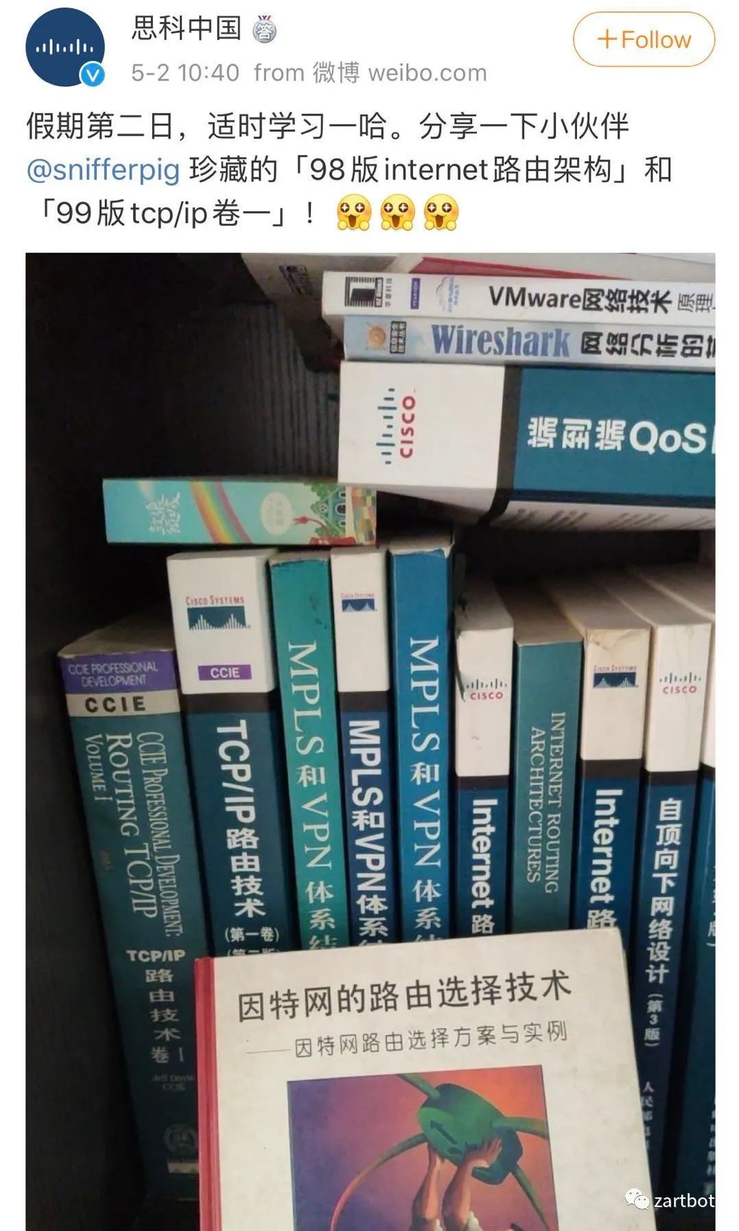 而那个年代的一个代表性的读物就是电子工业出版社翻译的一些Cisco Press的书,那些把交换机(Switch)翻译成开关的笑话是那个年代的图书的最大的特征,技术上更多的是教会大家路由协议的分类和计算原理,恰逢最近看到一个微博提到了一位老友的藏书,让大家一窥当时的风景。