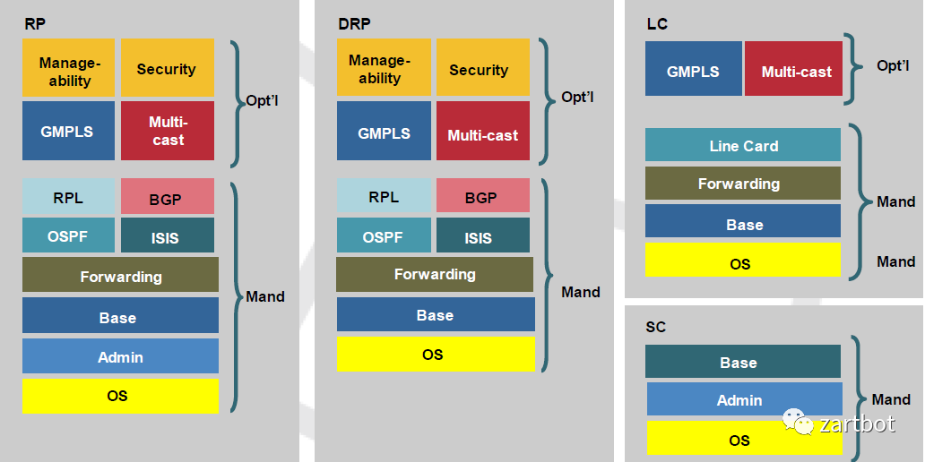 SDN的概念不得不提起Nick Mckeown,而大多数人并不知道这个概念的演进过程。最早Mckeown在1995年的论文《Fast Swtiched Backplane for a Gigabit Switched Router》设计了基于crossbar的交换矩阵,也就是Cisco GSR12000系列路由器的原型,后期Mckeown教授又提出了《Optics inside routers》即使用LB-BvN架构和MEMS构建一个分布式架构,大量的线卡和一个全光交换机的矩阵互联,但是当年商业化的产品由于MEMS不成熟,切换时间过长等限制,逐渐出现了基于Benes或者CLOS架构的多机框分布式集群,也就是思科的CRS-1和Juniper的TX-Matrix。但是在Cisco这些平台上也出现了一种叫PAL平台抽像层的结构和所谓的forwarding manager的软件架构, 这些便是SDN的雏形,软件上通过PAL层将分布式的线卡和控制面建立连接。OpenFlow也便是基于这种考量诞生的。例如当年IOS XR对外宣布的软件架构,大家可以看到有一个清晰的统一的Forwarding层的存在。
