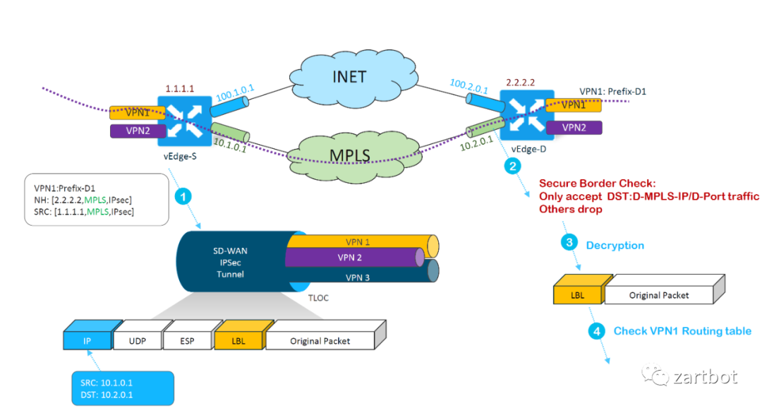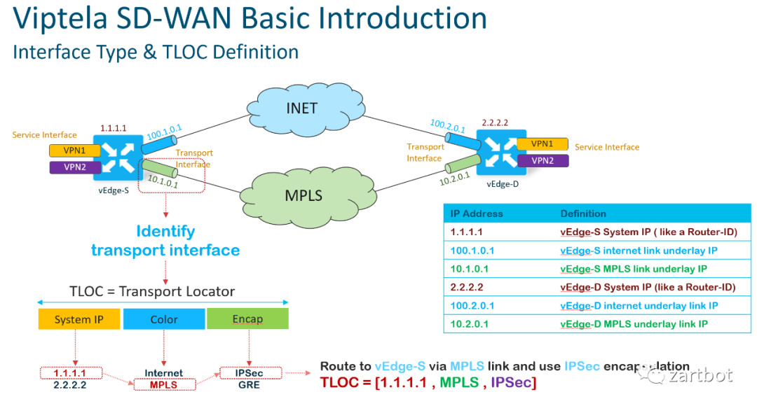 当你看到TLOC=<1.1.1.1,MPLS,IPsec>时,也就非常直观的知道,某个服务或者业务可以使用MPLS链路并执行IPsec封装到达1.1.1.1获取。