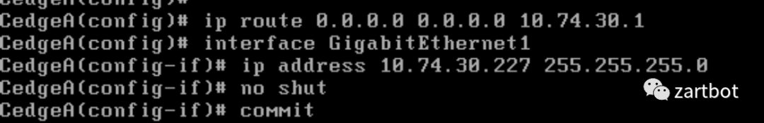 config-transactionhostname CE8300Aclock timezone china 8ntp server 10.74.5.1systemsystem-ip 203.0.0.1site-id 130001organization-name CiscoDMZvbond 101.37.116.217interface GigabitEthernet0/0/0ip address 10.74.6.133 255.255.255.0no shutip route 0.0.0.0 0.0.0.0 10.74.6.1commit