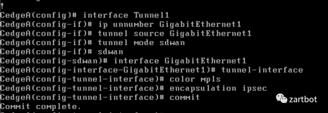 interface Tunnel1no shutdownip unnumbered GigabitEthernet0/0/0tunnel source GigabitEthernet0/0/0tunnel mode sdwanexitsdwaninterface GigabitEthernet0/0/0tunnel-interfaceencapsulation ipseccolor mplscommit