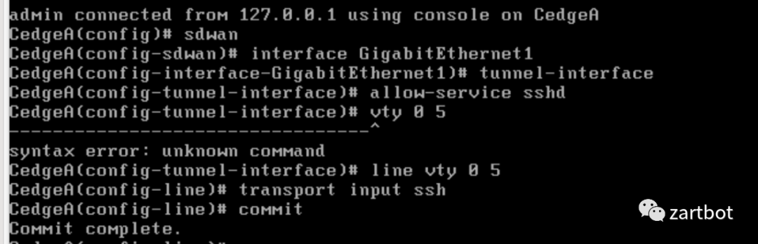 interface Tunnel1no shutdownip unnumbered GigabitEthernet1tunnel source GigabitEthernet1tunnel mode sdwanexitsdwaninterface GigabitEthernet1tunnel-interfaceencapsulation ipsecallow-service sshdcolor public-internetcommit