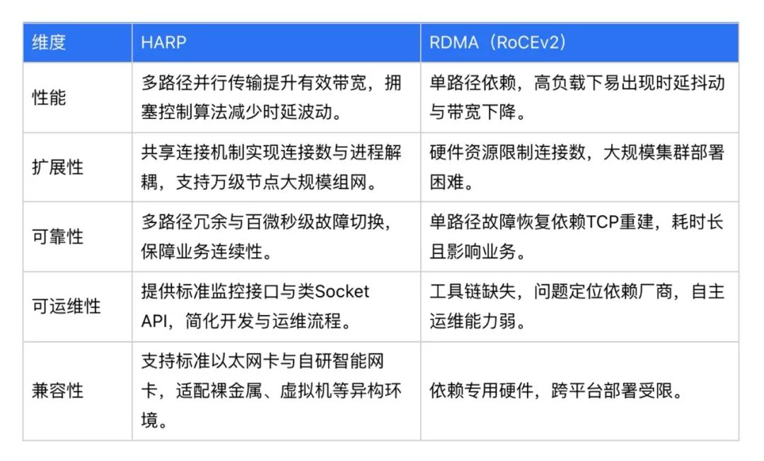 通过连接复用技术将应用层多进程通信复用到主机级/IP对级共享连接,有效避免了传统协议(如TCP/RDMA)因Fullmesh连接导致的连接数爆炸(如百万级 → 千级),从而突破硬件资源瓶颈;同时采用协议栈卸载设计,通过智能网卡硬件卸载传输层逻辑(如重传、拥塞控制),显著降低CPU负载,使单节点可支持10K+并发连接,适配超大规模数据库集群需求;确定性多路径的设计不仅天然支持横向扩容,新增节点时无需重构连接拓扑,还能保障系统性能的线性增长;此外,HARP兼具优秀的易运维特性,其采用类Socket API设计显著降低开发成本,配备全链路监控工具实现故障快速定位,在实际应用中长期稳定运行并展现出极高的可靠性。