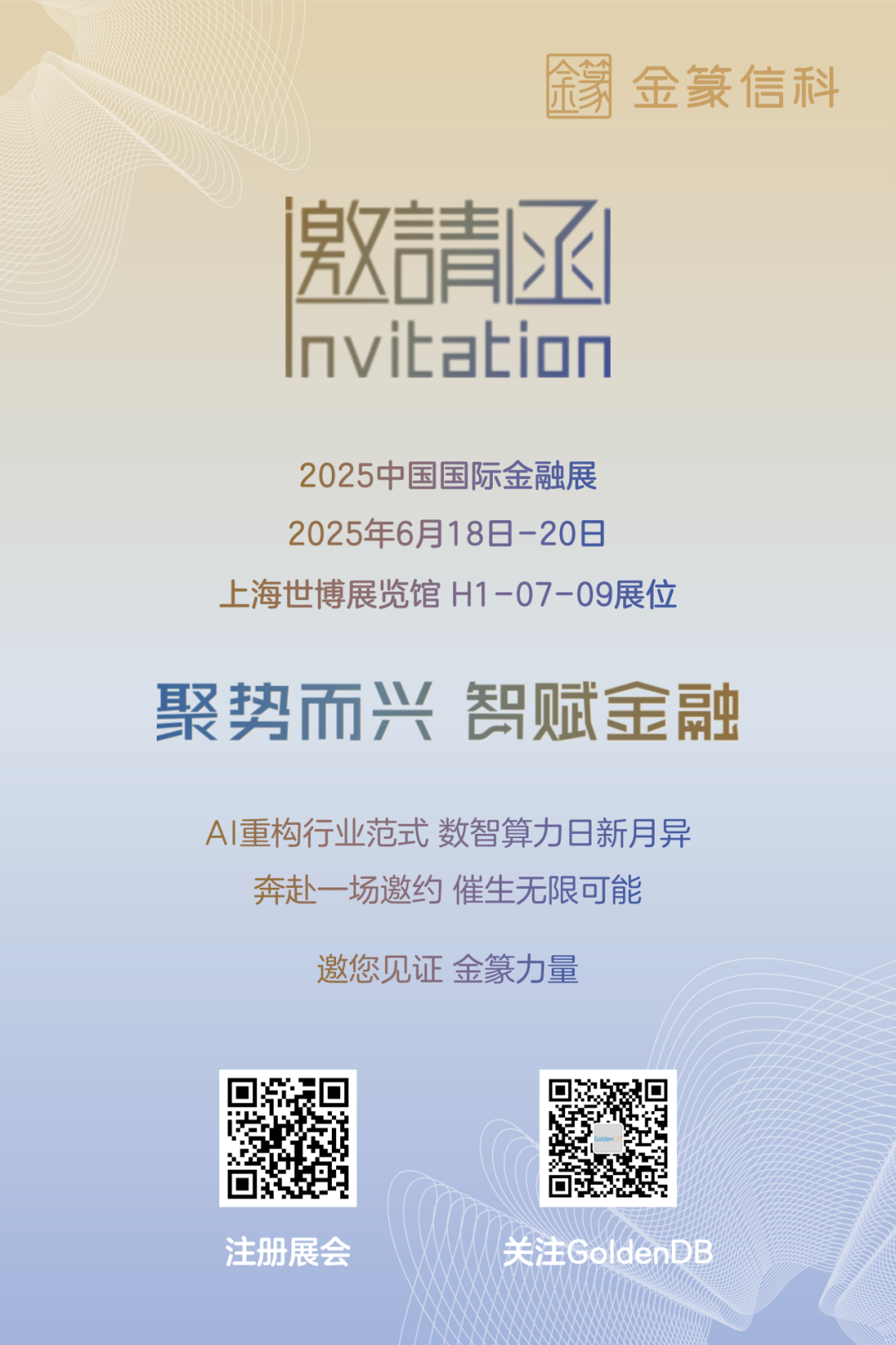 GoldenDB数据库将在H1-07-09展位,全面展示铸就金融核心引擎的领先实力。GoldenDB数据库已在银行核心系统零故障连续稳定运行超过5年,是业界唯一实现全面覆盖全类型金融机构核心系统的国产数据库。面向数字化转型新趋势,GoldenDB数据库一体化设计满足全场景需求,通过AI+DB驱动产品持续创新。