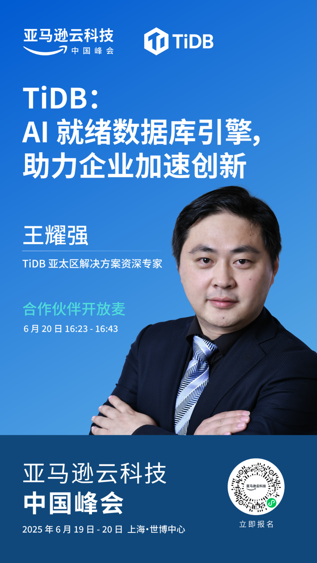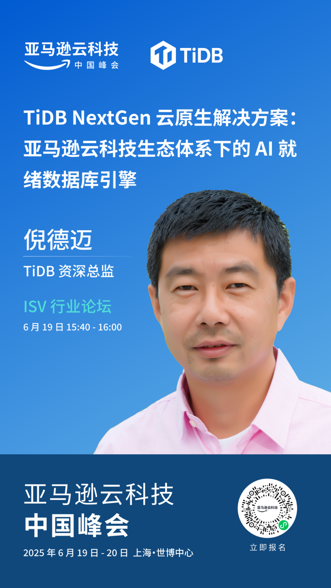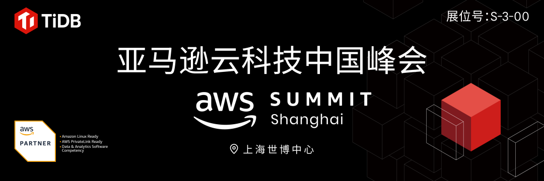 TiDB 作为云原生、AI Ready 的分布式 SQL 数据库引擎,将亮相「亚马逊云科技中国峰会·上海站」,在 S-3-00 展位、ISV 行业分会场、合作伙伴开放麦与大家共度这场科技盛会。