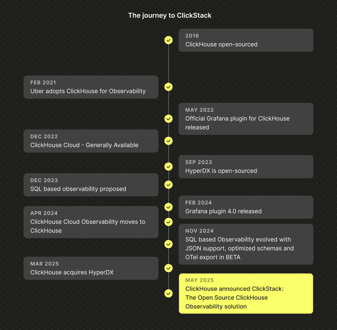 我们今天正式发布 ClickStack —— 一个基于 ClickHouse 构建的全新开源可观测性(Observability)解决方案。ClickStack 提供日志、指标、链路追踪和会话回放等功能的全套体验,即装即用,性能强劲,架构开放,人人可用。