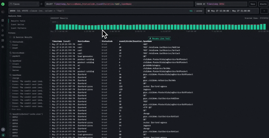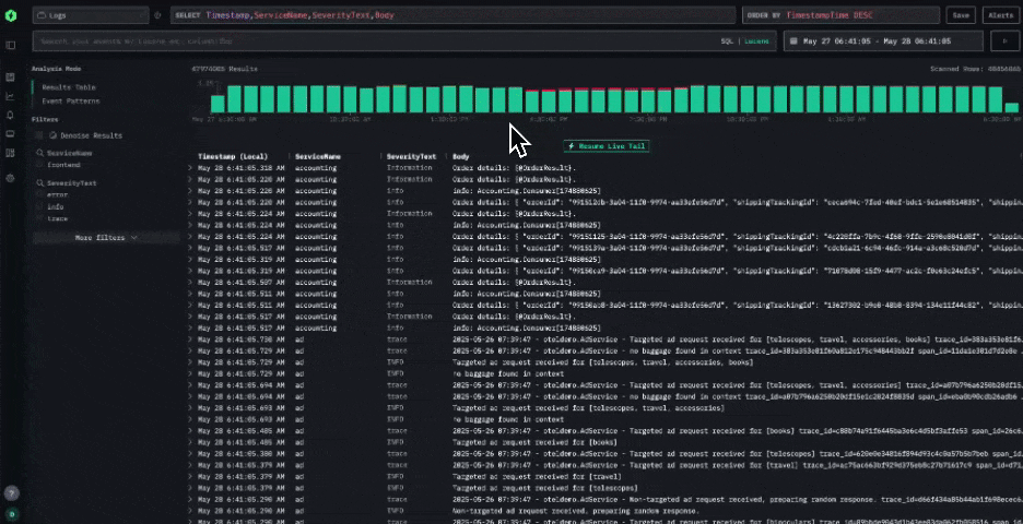 此外,尽管我们一直强调 SQL 在推动宽事件可观测性模型中的重要作用,我们也明白,用户的使用习惯同样值得尊重。搜索引擎如 ELK 之所以成功,关键就在于它们提供了直观易用的体验 —— 尤其是那种类似自然语言的日志查询方式。我们也希望将这种体验带给用户,但在此基础上,提供的是由 ClickHouse 引擎驱动的强大能力。