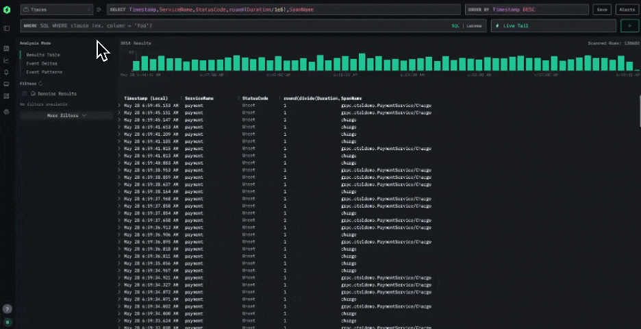 与此同时,我们仍坚持 SQL 为核心。SQL 是数据领域的通用语言,对大多数 ClickHouse 深度用户而言,依旧是探索数据最具表现力、最高效的方式。因此,HyperDX 的界面原生支持 SQL 查询 —— 高级用户可以直接操控底层引擎,不做妥协。