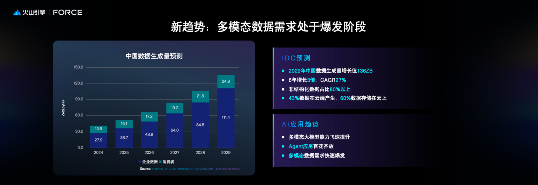 根据IDC的预测,多模态数据规模从24年到29年在中国和全球范围内都处在一个高速增长阶段。6年内增长3倍以上,年均复合增长率接近30%。且4成以上的数据在云端产生,6成以上的数据存储在云上。