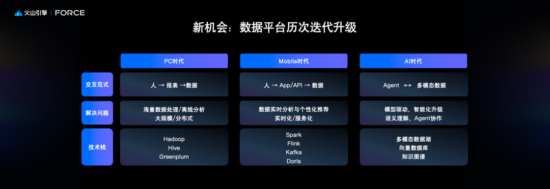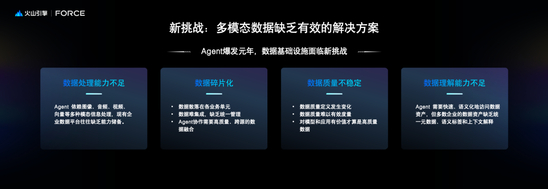 2025年6月11日,在北京举行的火山引擎FORCE原动力大会上,火山引擎数智平台产品负责人王彦辉分析了当前数据基础设施领域的趋势和挑战,并介绍了基于“多模态数据湖”的新一代AI云原生数据基础建设方案。