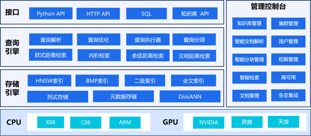 浪潮云向量数据库产品由存储引擎、查询引擎、接口、管理控制台四部分组成,全面支持X86、ARM CPU架构及主流GPU卡。