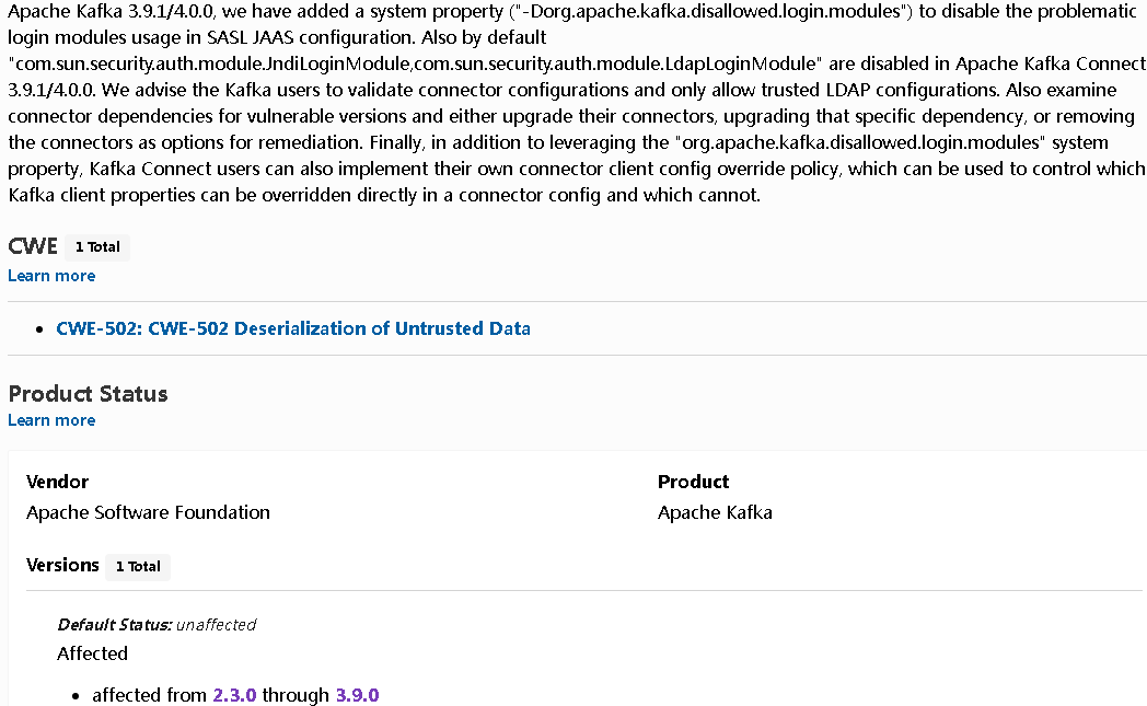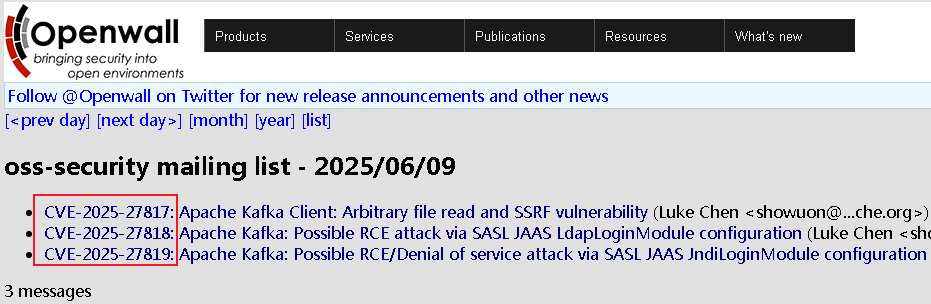 最近一周时间研发接连收到多个政务行业局点现场人员反馈,需要分析修复Kafka最近曝出的高危漏洞。笔者查阅Openwall和CVE,发现2025年06月09日确实有三个Kafka高危漏洞,详细列表如下:
