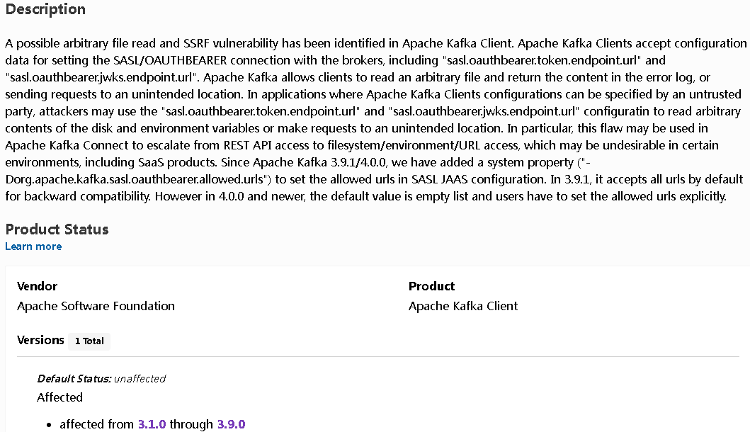 A possible arbitrary file read and SSRF vulnerability has been identified in Apache Kafka Client. Apache Kafka Clients accept configuration data for setting the SASL/OAUTHBEARER connection with the brokers, including "sasl.oauthbearer.token.endpoint.url" and "sasl.oauthbearer.jwks.endpoint.url". Apache Kafka allows clients to read an arbitrary file and return the content in the error log, or sending requests to an unintended location. In applications where Apache Kafka Clients configurations can be specified by an untrusted party, attackers may use the "sasl.oauthbearer.token.endpoint.url" and "sasl.oauthbearer.jwks.endpoint.url" configuratin to read arbitrary contents of the disk and environment variables or make requests to an unintended location. In particular, this flaw may be used in Apache Kafka Connect to escalate from REST API access to filesystem/environment/URL access, which may be undesirable in certain environments, including SaaS products. Since Apache Kafka 3.9.1/4.0.0, we have added a system property ("-Dorg.apache.kafka.sasl.oauthbearer.allowed.urls") to set the allowed urls in SASL JAAS configuration. In 3.9.1, it accepts all urls by default for backward compatibility. However in 4.0.0 and newer, the default value is empty list and users have to set the allowed urls explicitly.