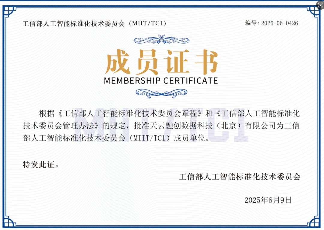 近日,天云数据凭借在人工智能领域深厚的技术积累与创新实力,成为工业和信息化部人工智能标准化技术委员会(简称“标委会”)成员单位。这一重要身份不仅标志着天云数据在人工智能领域的技术实力和行业影响力获得国家层面的高度认可,同时也意味着企业将在推动我国人工智能标准化建设中承担更多责任,助力行业规范化、高质量发展。