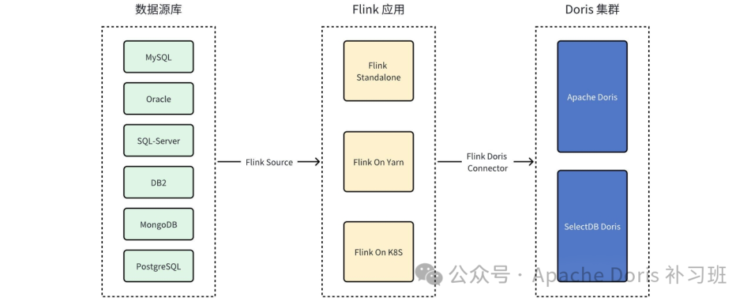 本方案借助 Flink 社区完善的 Source 生态,以及功能丰富强大的 Flink-Doris-Connector 组件来联合完成。
