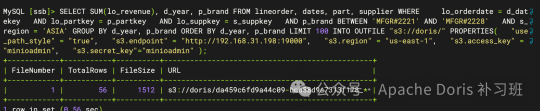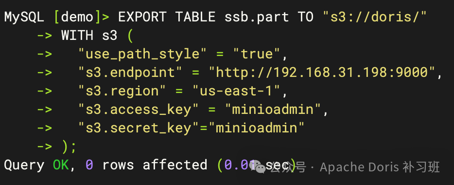 EXPORT TABLE ssb.port TO"s3://${BUCKET}/${S3_PATH}"
