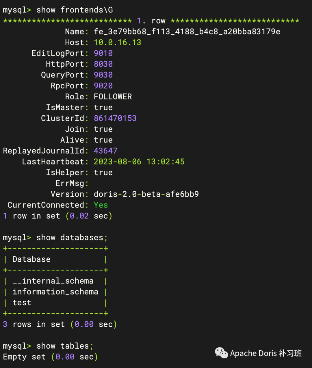 的 Doris 集群,添加宿主机 FE 至容器集群mysql -uroot -P9030 -h10.0.16.15