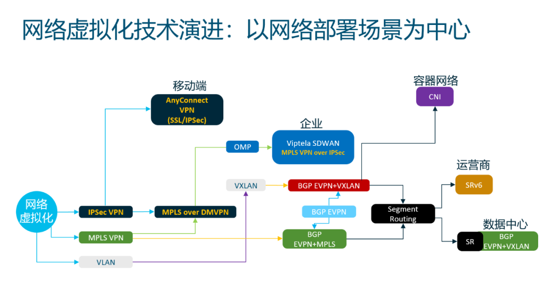 等各个事业部。很多网络技术也是为了解决某个特定场景的问题而提出的。当然在这个过程中也相互借鉴,例如将MPLS VPN技术应用于Ipsec VPN之上构成了现在的企业网SDWAN架构的最佳实践。而VXLAN等技术又伴随着BGP EVPN等运营商技术的发展构建了现代数据中心的基础架构。