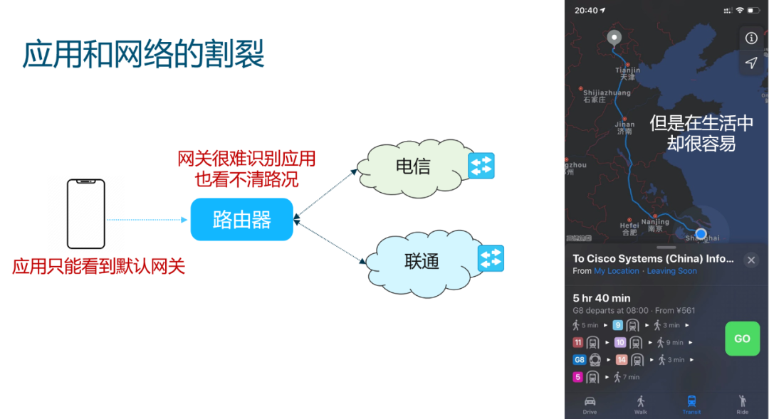 现在的架构中,应用和网络是完全割裂开的,很多时候当我们有一个双线路由器的时候,而我们的手机只能看到默认网关一条路。我们期待路由器能够识别应用并根据性能智能的调度路径,但是这些操作通常非常复杂。
